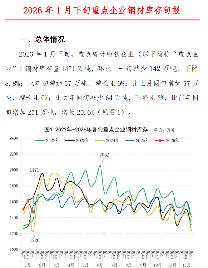 Home期货中钢协:1月下旬重点企业钢材库存1471万吨 环比下降8.8% 期货 2026 年 2 月 5 日 中钢协:1月下旬重点企业钢材库存1471万吨 环比下降8.8% By 古方信息网 - Advertisement - 新华财经北京2月5日电中国钢铁工业协会5日公布的数据显示,2026年1月下旬,重点统计钢铁企业(以下简称“重点企业”)钢材库存量1471万吨,环比上一旬减少142万吨,下降8.8%;比年初增加57万吨,增长4.0%;比上月同旬增加57万吨,增长4.0%;比2025年同旬减少64万吨,下降4.2%,比2024年同旬增加251万吨,增长20.6%。 分地区看,六大地区中,除西北地区重点企业钢材库存较上一旬有所增长外,其它地区均有不同程度下降。 (新华财经) 文章转载自 东方财富 - Advertisement - Must Read 股票 告别艾格时代:迪士尼下一站是“体验为王”? 古方信息网 - 2026 年 2 月 6 日 - Advertisement - 24小时 机构调研丨人形机器人+储能+军工 这家公司新增多家海外客户 Q1有望批量交付高速铜缆产品 2026 年 2 月 6 日 贵金属 1月28日美市更新支撑阻力:18品种支撑阻力(金银铂钯原油天然气铜及十大货币对) 2026 年 2 月 6 日 期货 银价快速跳水 日内跌幅超14%!分析师警告:小心逢低买入反被套 2026 年 2 月 6 日 Related News 股票 告别艾格时代:迪士尼下一站是“体验为王”? 2026 年 2 月 6 日 24小时 机构调研丨人形机器人+储能+军工 这家公司新增多家海外客户 Q1有望批量交付高速铜缆产品 2026 年 2 月 6 日 贵金属 1月28日美市更新支撑阻力:18品种支撑阻力(金银铂钯原油天然气铜及十大货币对) 2026 年 2 月 6 日 期货 银价快速跳水 日内跌幅超14%!分析师警告:小心逢低买入反被套 2026 年 2 月 6 日 基金 煤炭ETF涨超9% 2026 年 2 月 6 日 - Advertisement -