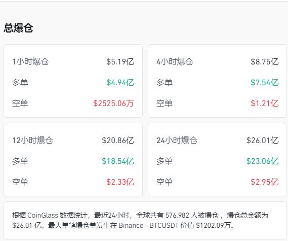 根据CoinGlass最新数据显示,最近24小时,全球共有577097人被爆仓,爆仓总金额为26.01亿美元(约合人民币180亿元)。