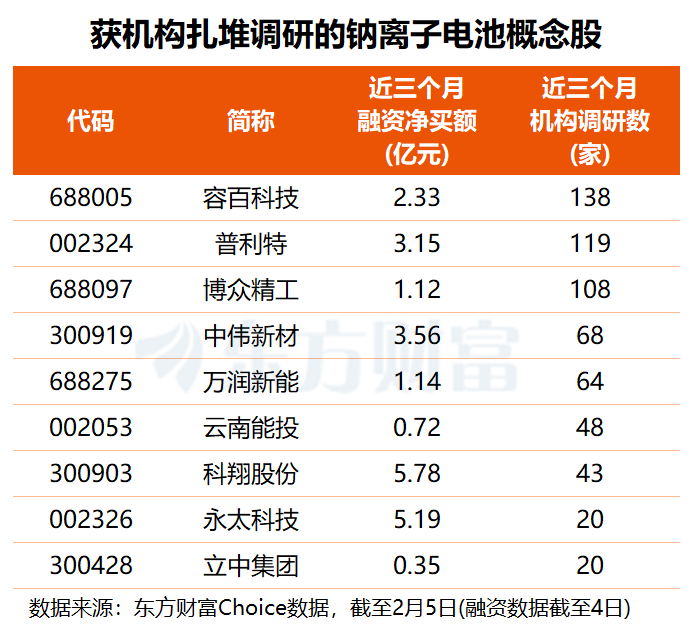 机构关注度方面,近三个月,共有17只钠电池概念股获得机构调研,容百科技、普利特、博众精工均获超百家机构扎堆调研,中伟新材、万润新能分别获68家和64家机构调研,云南能投、科翔股份也获逾40家机构关注。