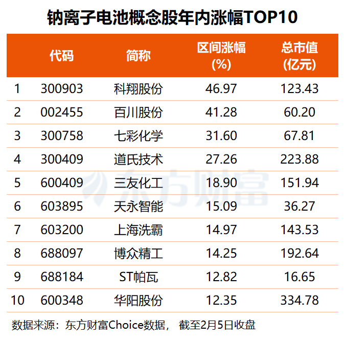 从业绩角度看,共有48只钠电池概念股披露2025年度业绩预告,其中,上海洗霸、格林美、道氏技术、天赐材料、芭田股份等13股净利预增,多氟多、天际股份、天永智能等8股成功扭亏,中国长城、科翔股份、万润新能等9股业绩出现好转。