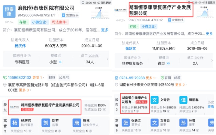 天眼查显示,襄阳恒泰康医院有限公司由湖南恒泰康康复医疗产业发展有限公司100%持股,而湖南恒泰康康复医疗产业发展有限公司由湖南爱尔健康产业发展有限公司81.9978%持股。襄阳恒泰康医院成立于2019年,企业注册资本500万元,实缴资本500万元,控股股东为湖南恒泰康康复医疗产业发展有限公司。