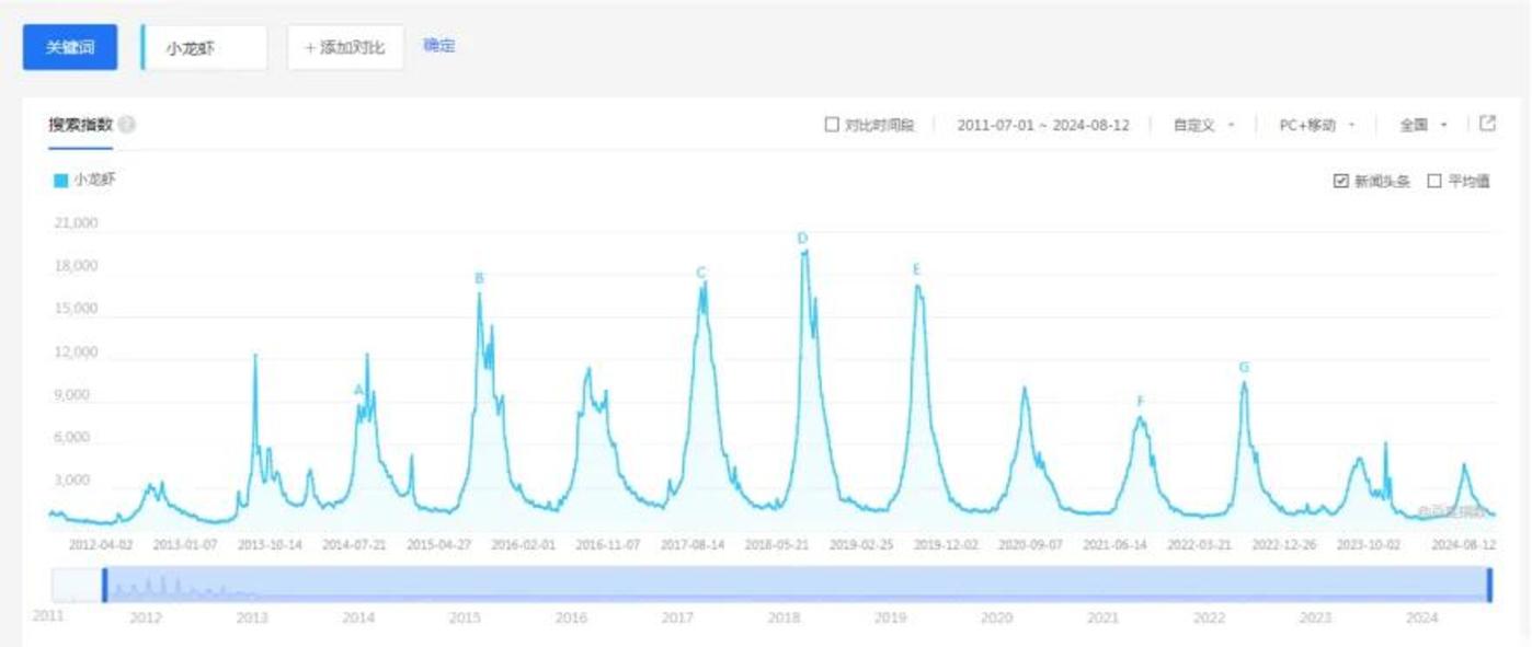 百度指数显示,2019年起,小龙虾热度开始下滑,直至2024年,小龙虾搜索指数峰值最高只有4000多,仅为2018年巅峰期的两成左右。