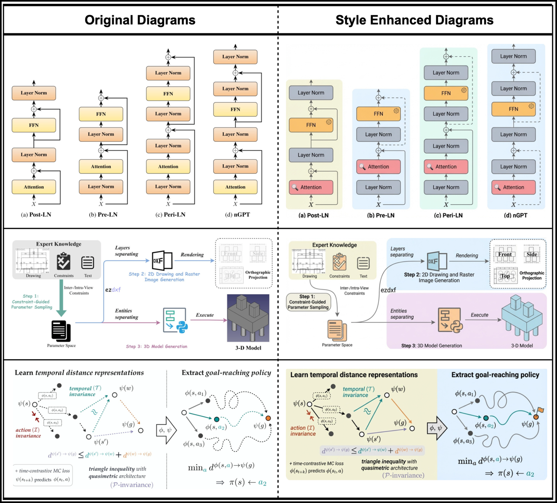 顶会级审美: 算法由真实文献驱动。Retriever(检索器)会参考相关领域的学术标准,确保生成的 Transformer 架构图或流程图符合 NeurIPS、ICML 等顶会要求。