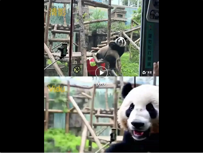 Vidu这个视频就很尴尬了,除了首帧是原图外,之后视频出现的熊猫太突兀了,而且和原熊猫没有关系。