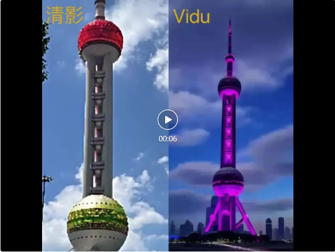 Vidu完整展示了东方明珠塔及亮灯,不过忽略了“从下往上依次”亮灯的需求,背景中云朵变幻非常快速,感觉像是视频被加了倍速。
