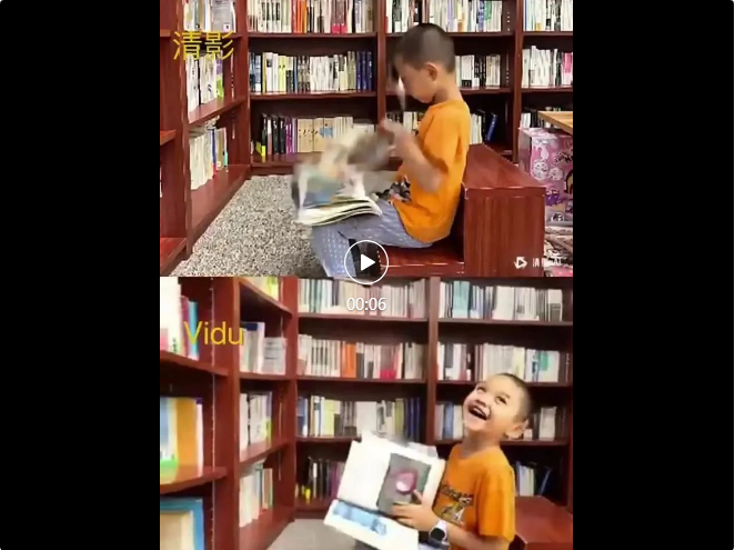 Vidu生成视频中,小孩举起书翻动、仰头等动作,整体更连贯自然。