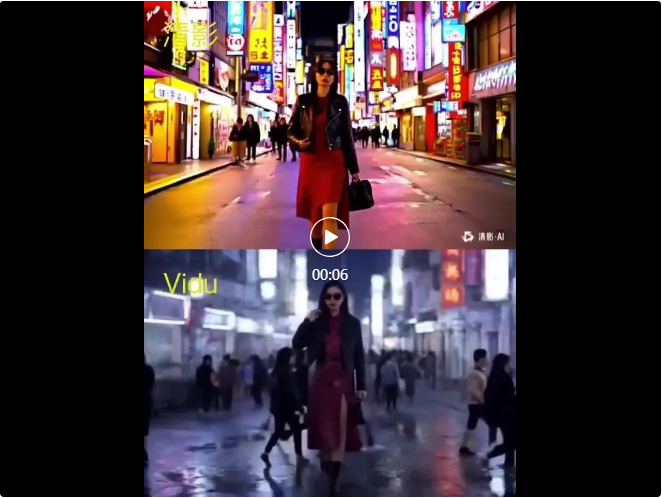 Vidu这个视频中,主人公特别突兀,其身高与周边路过和远方的人相比明显高出,显得格格不入。另外,背景街道景色过于模糊。