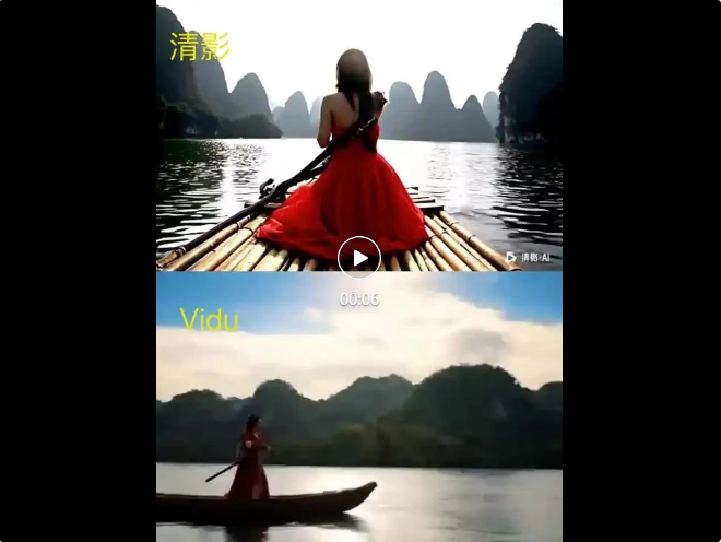 Vidu对竹筏理解有误,侠女乘坐的更像是小船,而且视频画面整体较为模糊。