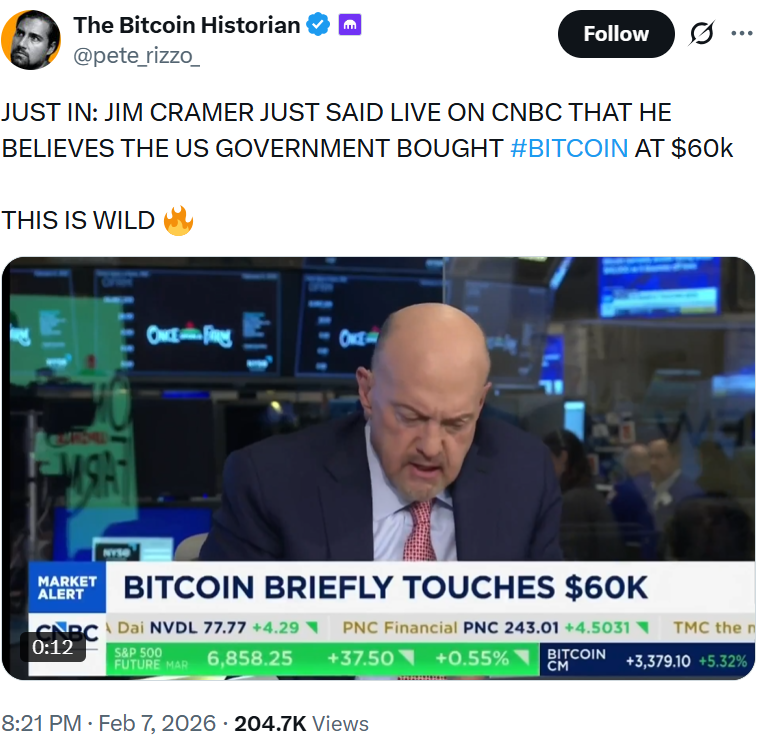 与此同时,美国知名财经主持人吉姆·克莱默在一档节目中称,白宫趁比特币跌至6万美元时吸纳了比特币。他透露,自己听说只要比特币跌至6万美元,特朗普就会把比特币储备填满。