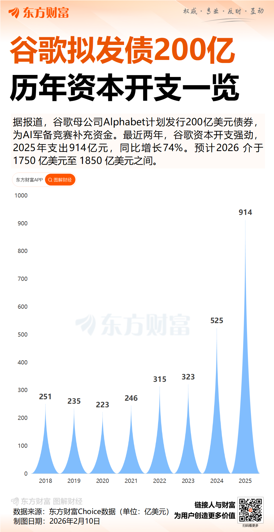 当前,Alphabet正在为其人工智能雄心背后的空前支出计划筹措资金。周一,Alphabet进行了其史上规模最大的美元债券发行,筹资200亿美元,超过最初预期的150亿美元。上周,Alphabet表示,其今年资本支出将高达1850亿美元。