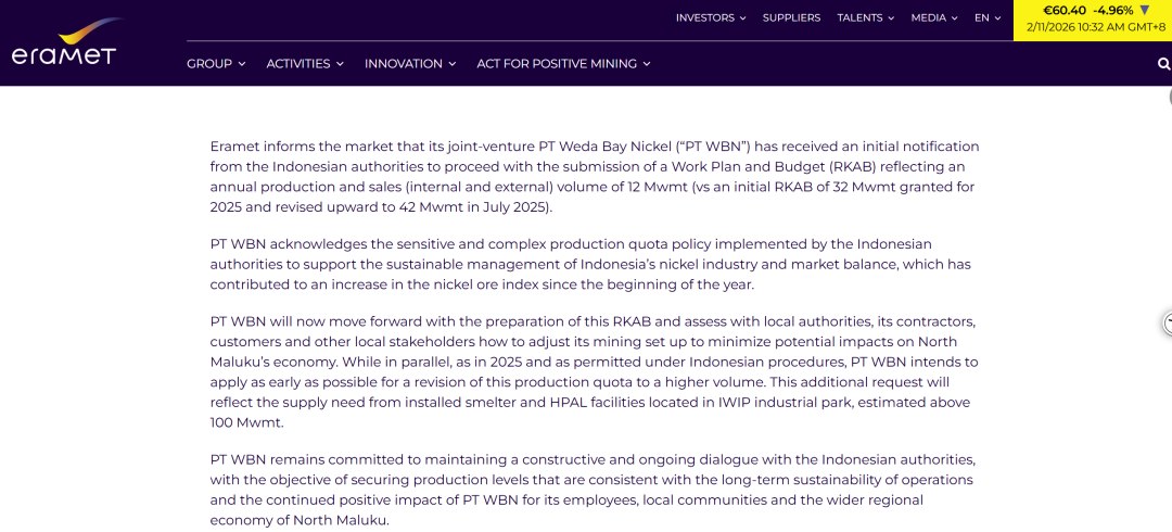艾瑞镁特表示,韦达湾镍矿现将进一步推进此项RKAB的准备工作,并与地方当局、承包商、客户及其他当地利益相关方共同评估如何调整采矿设施,尽可能降低潜在影响。与此同时,计划像2025年那样,在程序允许范围内尽快申请将生产配额提升至更高水平。