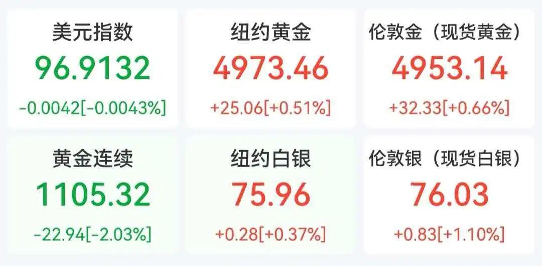昨夜国际贵金属价格大幅下挫,现货黄金一度跌破4900美元关口,现货黄金跌3.27%,现货白银跌10.84%。