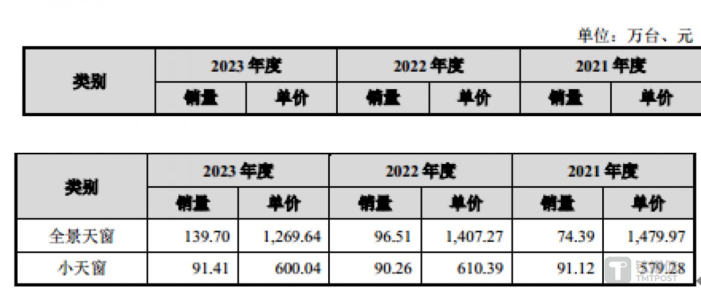 可见,全景天窗的单价持续下滑,销量持续增长。