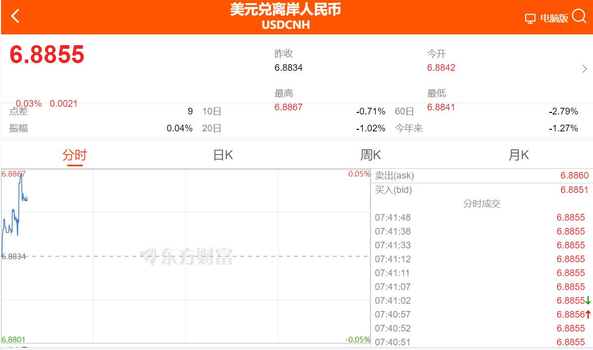 离岸人民币汇率继续保持强势,昨日夜盘升破6.89,截至发稿暂报6.8855。