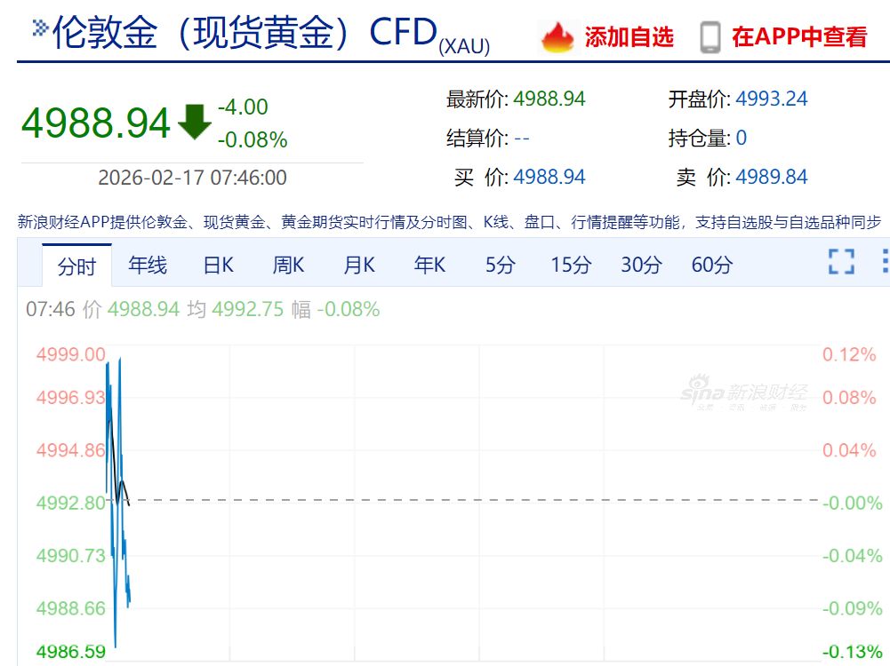 2月17日亚太早盘,现货金银短线下跌,现货黄金跌幅近10美元,现报4988.94美元/盎司,日内跌0.08%。现货白银跌幅一度达0.4美元,现报76.37美元/盎司,日内微跌0.1%。