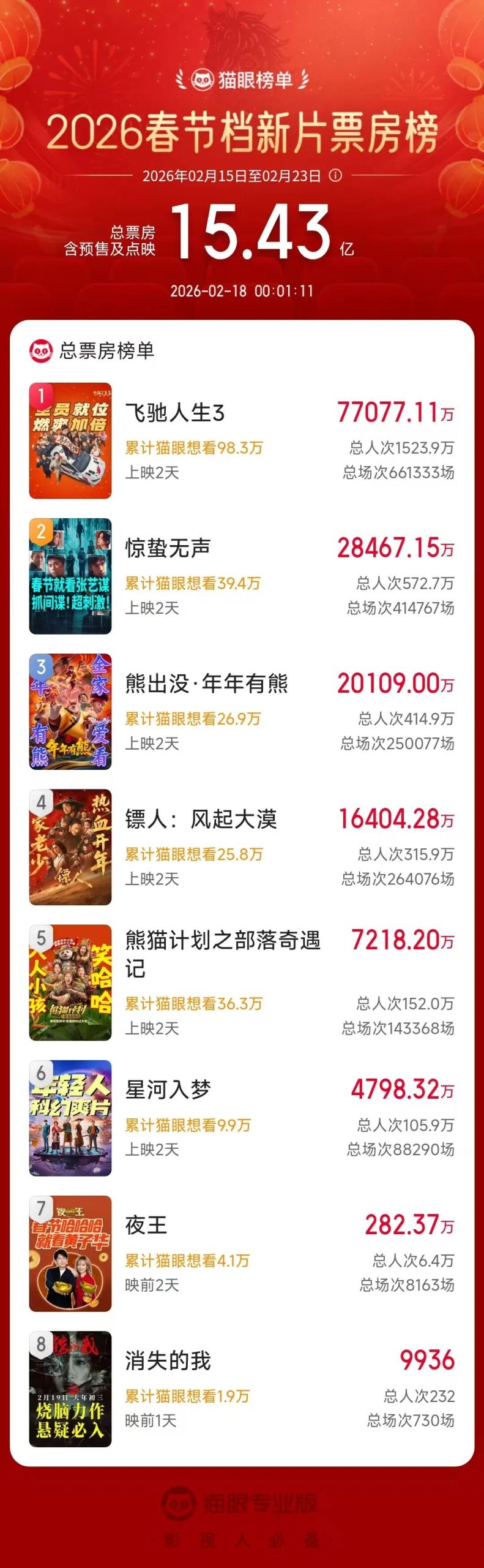 根据猫眼专业版数据,截至18日0点,2026年春节档总票房(含预售)超15亿元,《飞驰人生3》以超7.7亿元的成绩暂时领跑今年春节档大盘;《惊蛰无声》位列第二,票房超2.8亿元;《熊出没·年年有熊》和《镖人:风起大漠》位列第三、四位,累计票房也均已破亿。与此同时,2月17日大年初一的单日票房也已经超过了12.66亿元,超出了此前的市场预期,单日总场次数超57万场,刷新中国影史大年初一单日场次数纪录。
