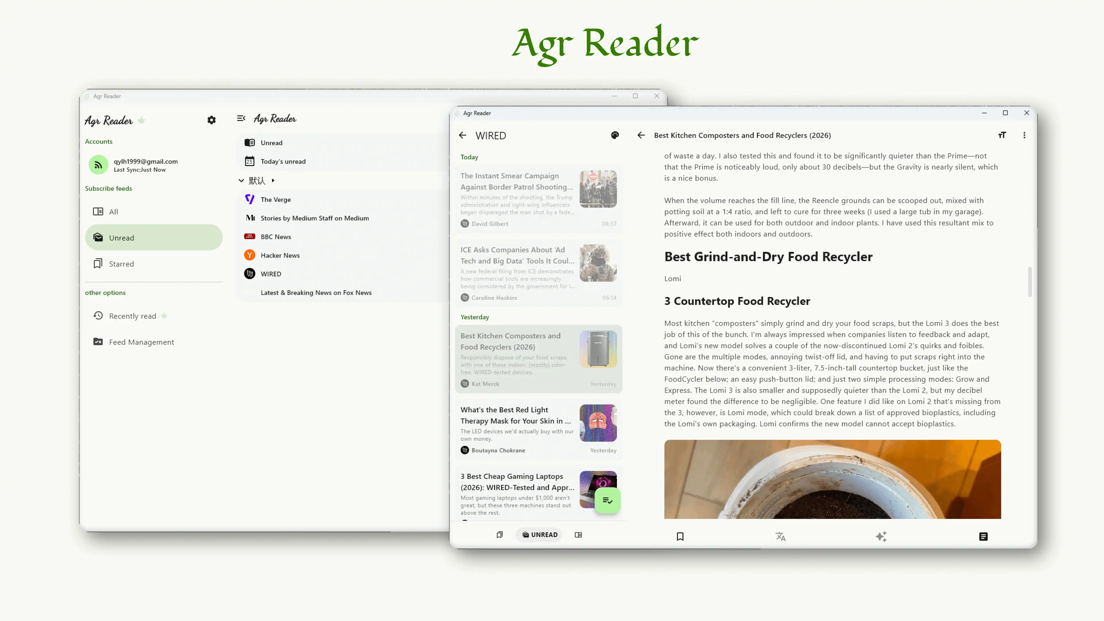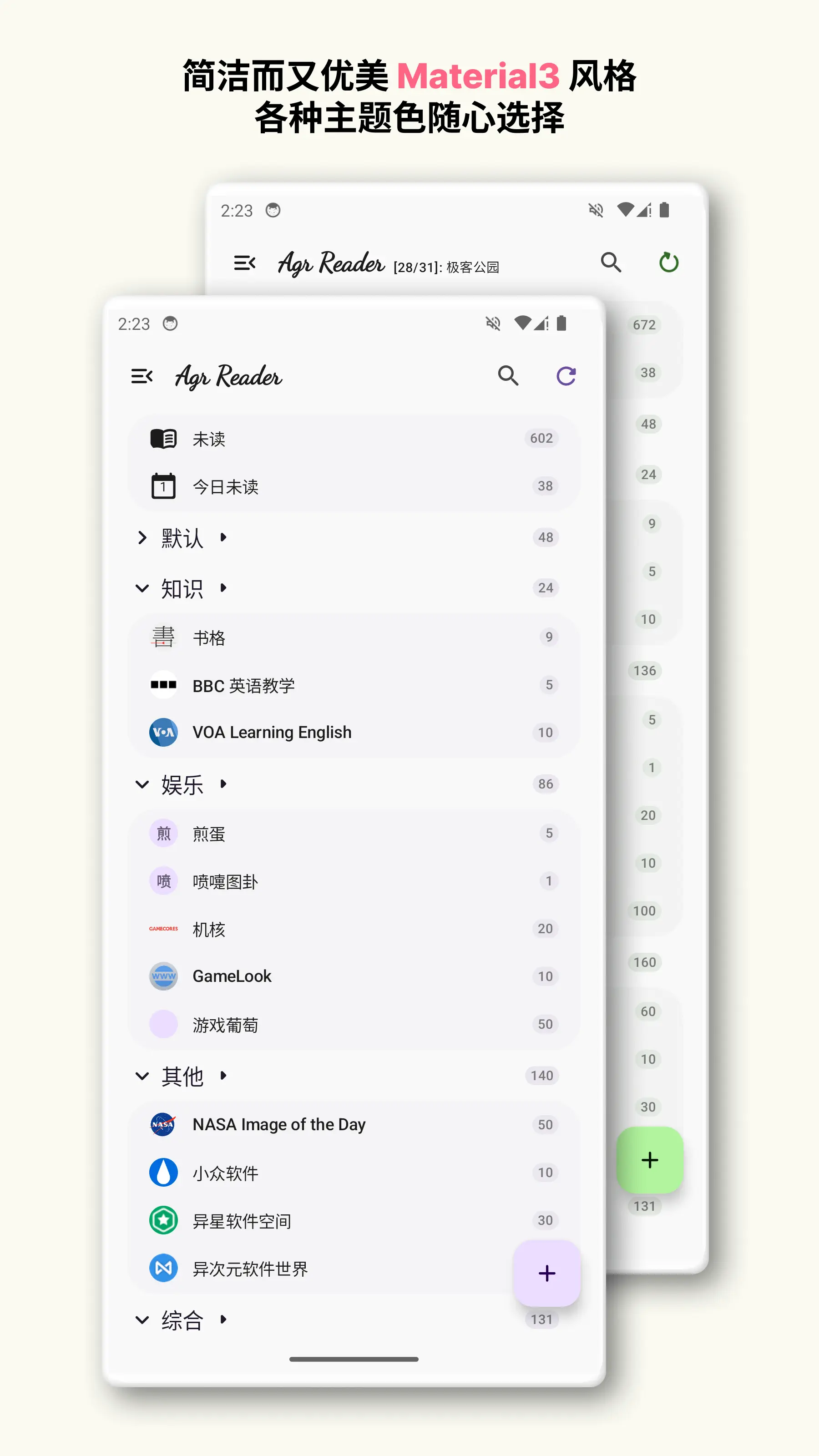 Agr Reader 是一款简洁、优美、Material You 风格的 RSS 阅读器,覆盖移动端与桌面端,让你把关注的内容集中到一个地方,用更干净、更高效的方式阅读与沉淀。