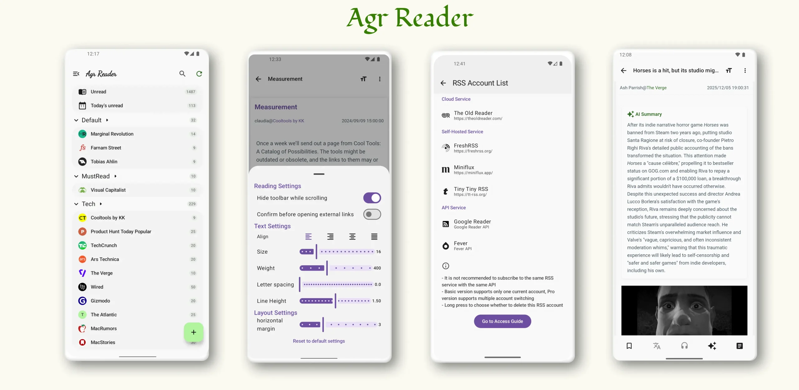 - Google Play:https://play.google.com/store/apps/details?id=com.lowae.agrreader(推荐下载面向国内用户的支持买断制的版本,Google Play 版本为订阅制)