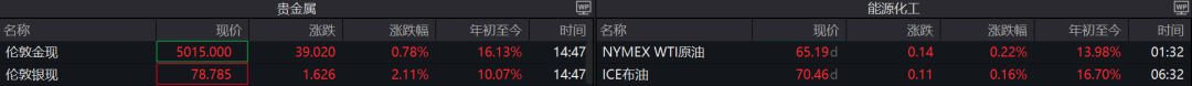 截至19日17时,伦敦现货金收报5015美元/盎司,年内涨幅超过16%;WTI原油期货和布伦特原油期货刚刚经历大涨,布伦特原油期货主力合约价格站上70美元/桶,年内涨幅也接近17%。