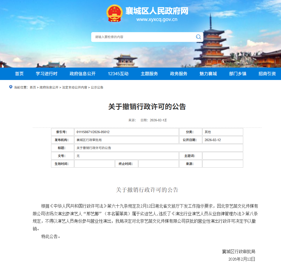 根据《中华人民共和国行政许可法》第六十九条规定及2月12日湖北省文旅厅下发工作指示要求,因北京艺苗文化传媒有限公司该场次演出参演艺人“那艺娜”(本名翟革英)属于劣迹艺人,违反了《演出行业演艺人员从业自律管理办法》第八条规定,不得以演艺人员身份参与营业性演出,我局决定对北京艺苗文化传媒有限公司获批的营业性演出行政许可决定予以撤销。