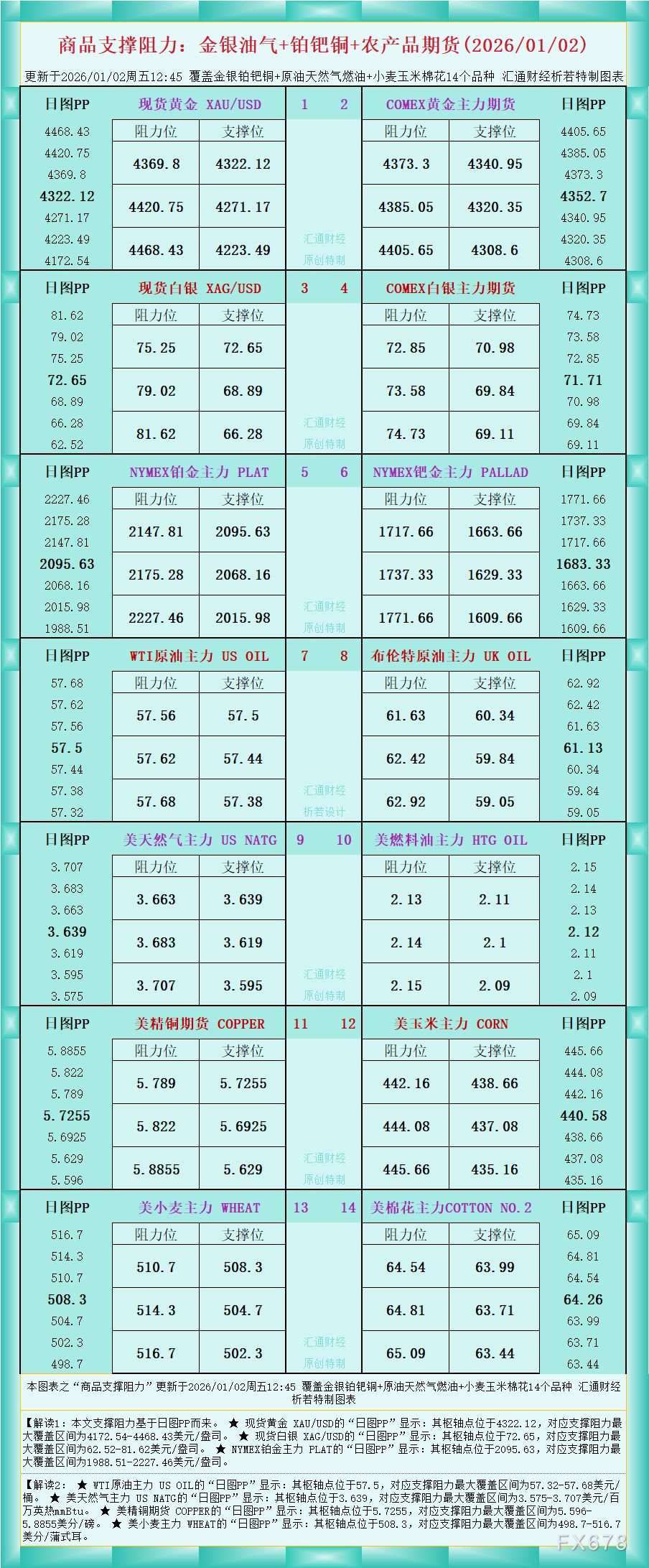 一张图看商品支撑阻力:金银油气+铂钯铜+农产品期货,更新于2026年1月2日周五12:45,具体覆盖金银铂钯铜+原油天然气燃油+小麦玉米棉花14个品种,更多详见汇通财经析若特制图表中的内容。
