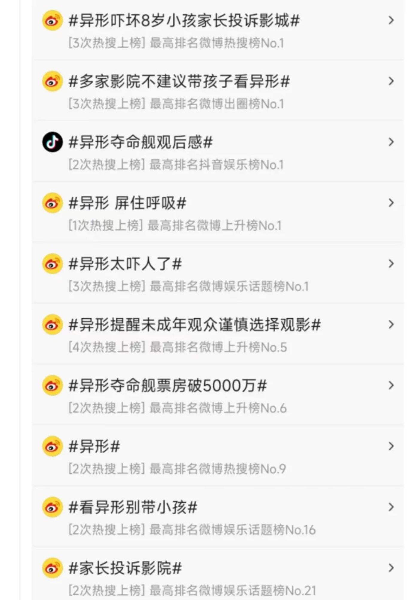 事件迅速在社交媒体上发酵,次日,“异形吓坏8岁小孩家长投诉影城”的话题三度登顶微博热搜,引发公众对《异形:夺命舰》的“恐怖程度”和“内容尺度”的广泛讨论。当天,相关话题在各大社交平台热榜上占据多达10个席位。