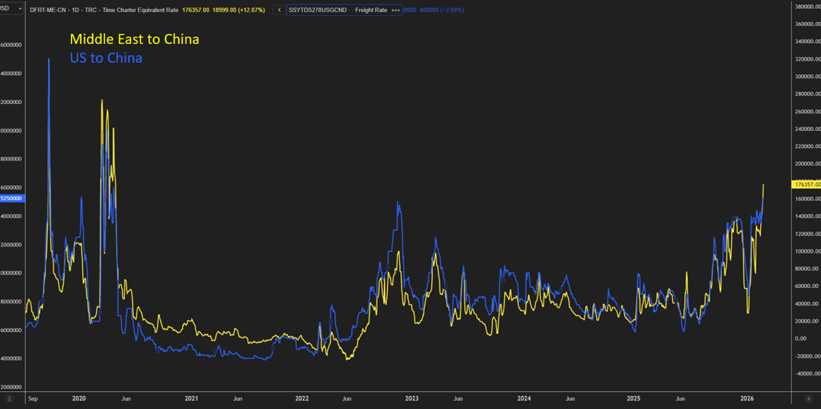 经纪商克拉克森(Clarksons)在一份报告中指出,VLCC现货运价的变动,并不需要实际运输的原油数量减少。报告写道:“只要市场对风险的感知上升,运价就可能迅速被重新定价——包括战争风险保费上调、船东要求因靠港该地区获得额外补偿,以及租船方为降低航期不确定性而提前、拉长订舱周期。”
