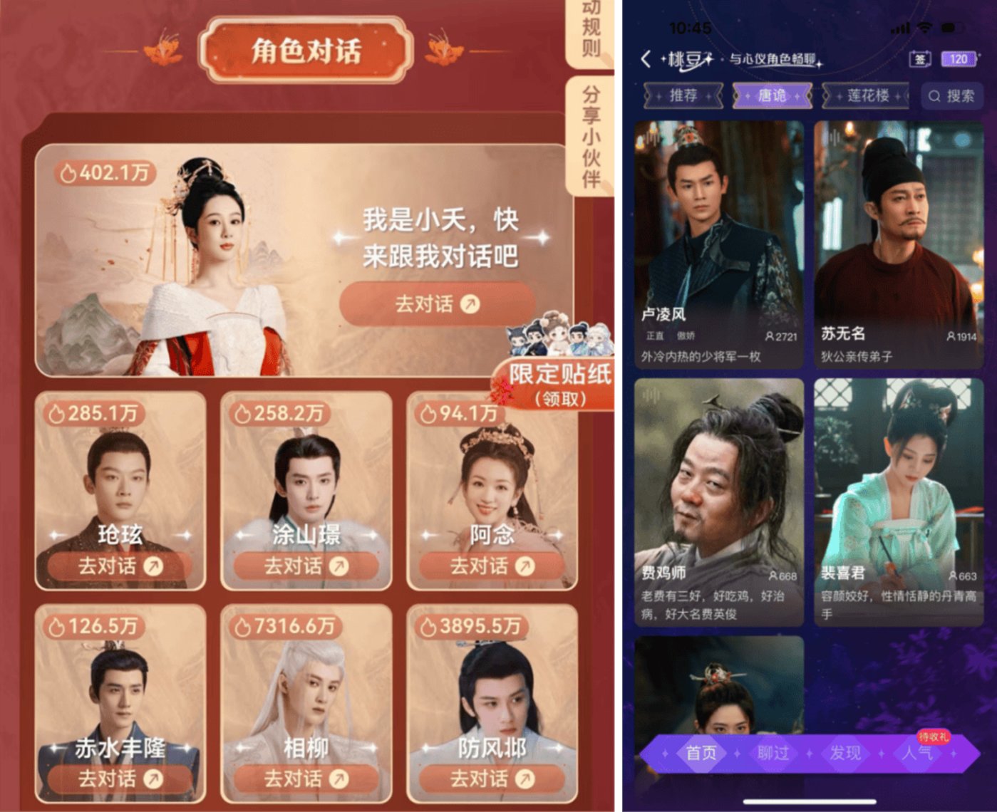 《长相思2》开播后,腾讯在站内为该剧上线了角色AI功能,使用户能够以语音对话的形式与自己喜爱的角色进行深度对话和互动,还可亲身体验“玱玹吃醋”“防风邶教会小夭有力自保”等剧中经典剧情桥段。粉丝不再是单纯追剧而是成为故事的一部分,这一互动玩法甚至比剧集内容出圈更快。