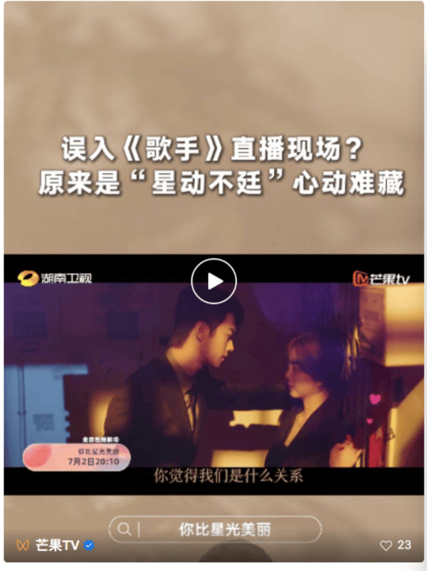 其二是结合已有宣发资源在站内花式整活。如《你比星光美丽》播出前,湖南卫视与芒果TV联动双平台“芒系IP”为剧集花式造势,并将谭松韵与芒果剧集的深厚渊源融入到宣推造势中,00后爆改魔性整活式预告、独家芒果味预告等创意物料引发观众关注、为开播造热。