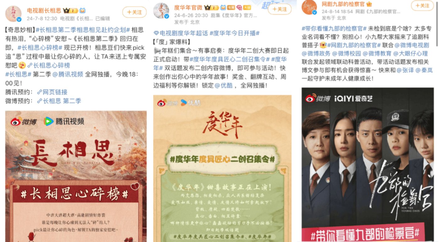 许多剧集还会在官博策划打榜任务、二创、剧评等不同形式的互动类活动,调动用户自发加入到剧集传播大军之中。如《长相思2》在开播前开启#长相思心碎榜#,通过打榜积累心碎值的形式可获得对应角色的专属“安慰”;《度华年》发起#度华年度具匠心二创召集令#话题向用户征集二创视频;《九部的检察官》联合多个行业大V发起领域联动科普活动,鼓励更多用户参与了解未检相关知识,等等。