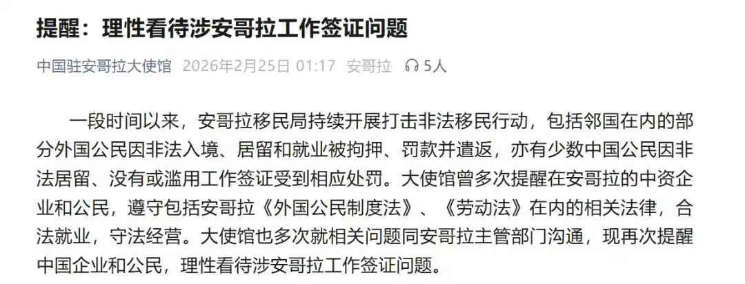 2月25日,中国驻安哥拉大使馆发布《提醒:理性看待涉安哥拉工作签证问题》。详情如下: