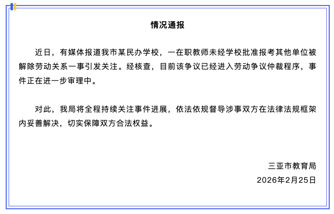 海南省三亚市教育局2月25日发布情况通报: