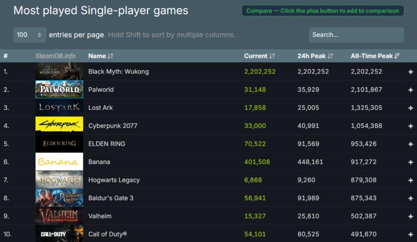 “国游销量榜”数据显示,《黑神话:悟空》在Steam上已售出超过300万份,加上腾讯WeGame、Epic和PS平台,目前总销量超过450万份,总销售额超过15亿元。 其中,Steam在线人数峰值突破200万,超越了《幻兽帕鲁》《CS 2》,达到Steam同时在线人数榜单历史第二,已创下同时在线玩家最多的付费买断制单机游戏纪录。
