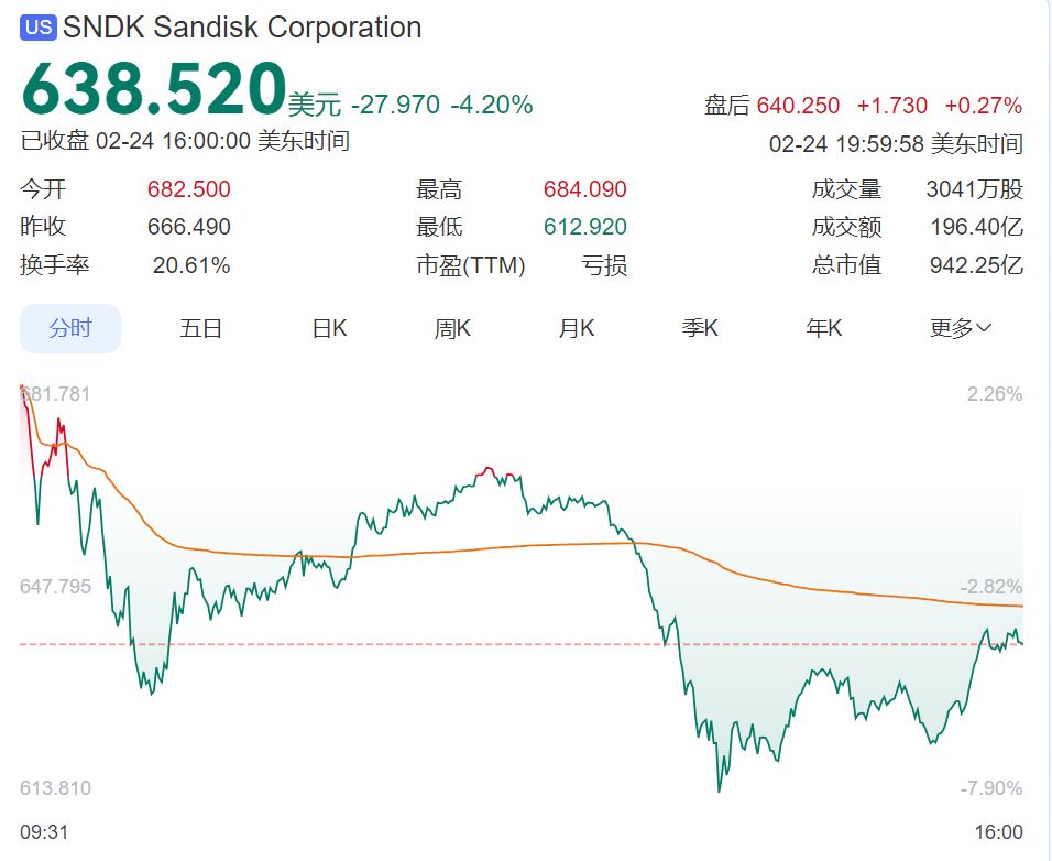 帖子发出后,闪迪(SNDK)股价周二早盘跳水,午盘之初曾短线转涨,后跌幅再度扩大、一度跌近8%,最终收跌4.2%。香橼发布做空声明前,闪迪股价2026年以来表现亮眼,股价累计涨约175%。
