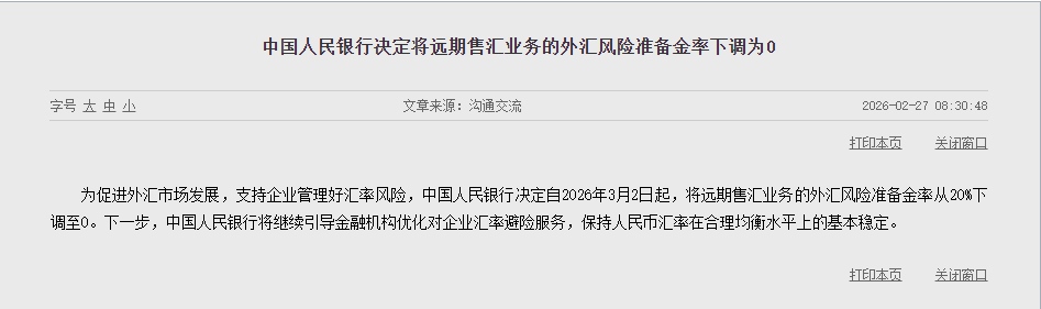 Home外汇央行:将远期售汇业务的外汇风险准备金率从20%下调至0 外汇 2026 年 2 月 27 日 央行:将远期售汇业务的外汇风险准备金率从20%下调至0 By 古方信息网 - Advertisement - 为促进外汇市场发展,支持企业管理好汇率风险,中国人民银行决定自2026年3月2日起,将远期售汇业务的外汇风险准备金率从20%下调至0。下一步,中国人民银行将继续引导金融机构优化对企业汇率避险服务,保持人民币汇率在合理均衡水平上的基本稳定。 相关报道 五连涨!人民币持续升值 受益股出炉 低估值+低涨幅 仅30只! (央行网站) 文章转载自 东方财富 - Advertisement - Must Read 股票 三大期指齐涨;布油失守108美元/桶,石油股走低;现货黄金向上触及4700美元;存储股普涨,闪迪涨超4%;特斯拉、Meta涨超1% | 美股盘前 每日经济新闻 - 2026 年 4 月 6 日 - Advertisement - 24小时 杀疯了!量化基金集体狂飙 四家“顶流”私募规模均超800亿元 百亿级已超50家 谁在投资? 2026 年 4 月 6 日 期货 石油断供警报持续升级 八大产油国“象征性”增产无济于事 2026 年 4 月 6 日 贵金属 特朗普想速战速决击垮伊朗,海湾国家恐被拖入长期险境 2026 年 4 月 6 日 Related News 股票 三大期指齐涨;布油失守108美元/桶,石油股走低;现货黄金向上触及4700美元;存储股普涨,闪迪涨超4%;特斯拉、Meta涨超1% | 美股盘前 2026 年 4 月 6 日 24小时 杀疯了!量化基金集体狂飙 四家“顶流”私募规模均超800亿元 百亿级已超50家 谁在投资? 2026 年 4 月 6 日 期货 石油断供警报持续升级 八大产油国“象征性”增产无济于事 2026 年 4 月 6 日 贵金属 特朗普想速战速决击垮伊朗,海湾国家恐被拖入长期险境 2026 年 4 月 6 日 24小时 霍尔木兹海峡大消息!明天A股会怎么走? 2026 年 4 月 6 日 - Advertisement -