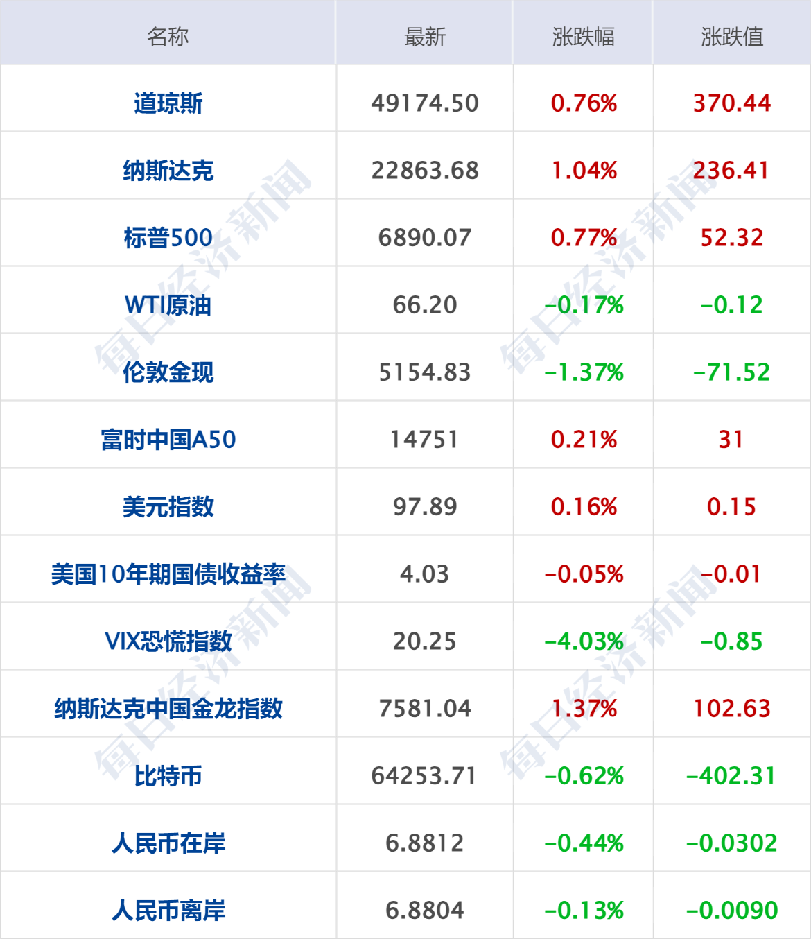 美股三大指数集体收涨,纳指涨1.04%,标普500指数涨0.77%,道指涨0.76%;大型科技股多数上涨,AMD涨超8%,英特尔涨超5%,特斯拉、奈飞、苹果涨超2%,微软、亚马逊涨逾1%,英伟达、Meta小幅上涨,谷歌小幅下跌;PayPal两个交易日累计上涨13%,创2022年以来最大同期涨幅。中概股多数上涨,纳斯达克中国金龙指数涨1.37%,世纪互联、小鹏汽车涨超6%,霸王茶姬涨近5%,金山云涨超4%,禾赛科技跌超2%,再鼎医药跌逾1%。