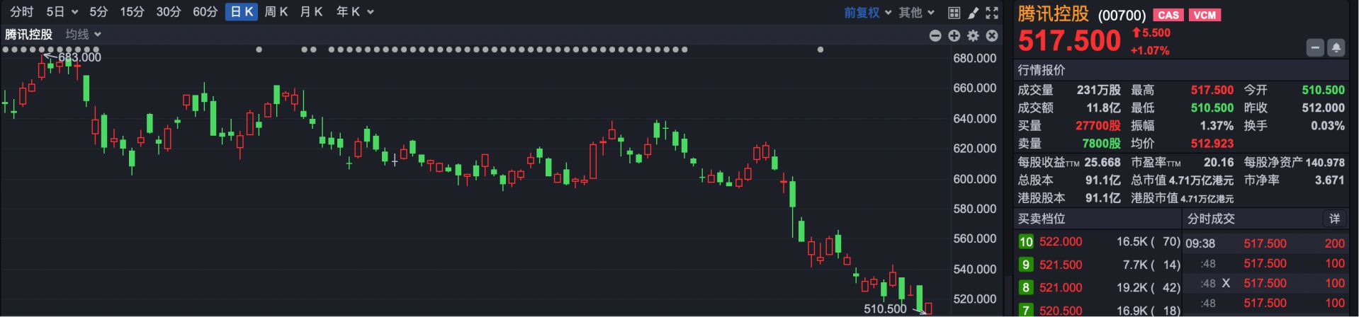 腾讯控股(HK00700)早盘小幅反弹,截至发稿,涨幅1.07%。