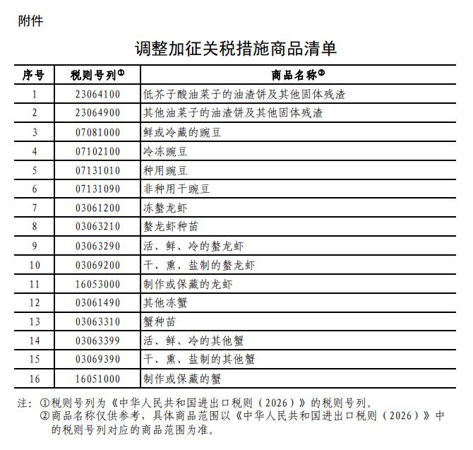为落实中加两国领导人达成的重要共识,根据《中华人民共和国关税法》、《中华人民共和国海关法》、《中华人民共和国对外贸易法》等法律法规和国际法基本原则,国务院关税税则委员会发布公告,自2026年3月1日至2026年12月31日,调整《国务院关税税则委员会关于对原产于加拿大的部分进口商品加征关税的公告》(税委会公告2025年第3号)规定的加征关税措施,不加征对原产于加拿大的油渣饼、豌豆加征的100%关税以及对原产于加拿大的龙虾、蟹加征的25%关税。