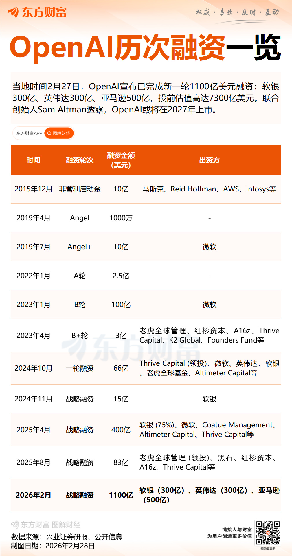 当地时间2月27日,OpenAI宣布完成1100亿美元的新一轮融资,投前估值高达7300亿美元。其中包括来自软银的300亿美元、英伟达的300亿美元以及亚马逊的500亿美元。