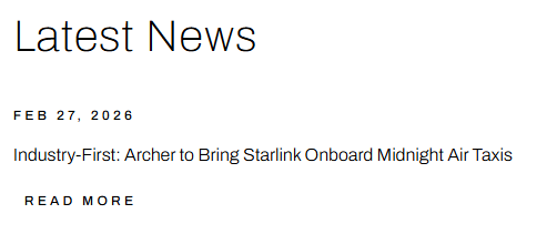 当地时间周五(2月27日),电动垂直起降飞行器(eVTOL)公司Archer Aviation Inc.在官网宣布,公司将与星链(Starlink)合作,为空中出租车提供稳定、可靠和高速的互联网服务。