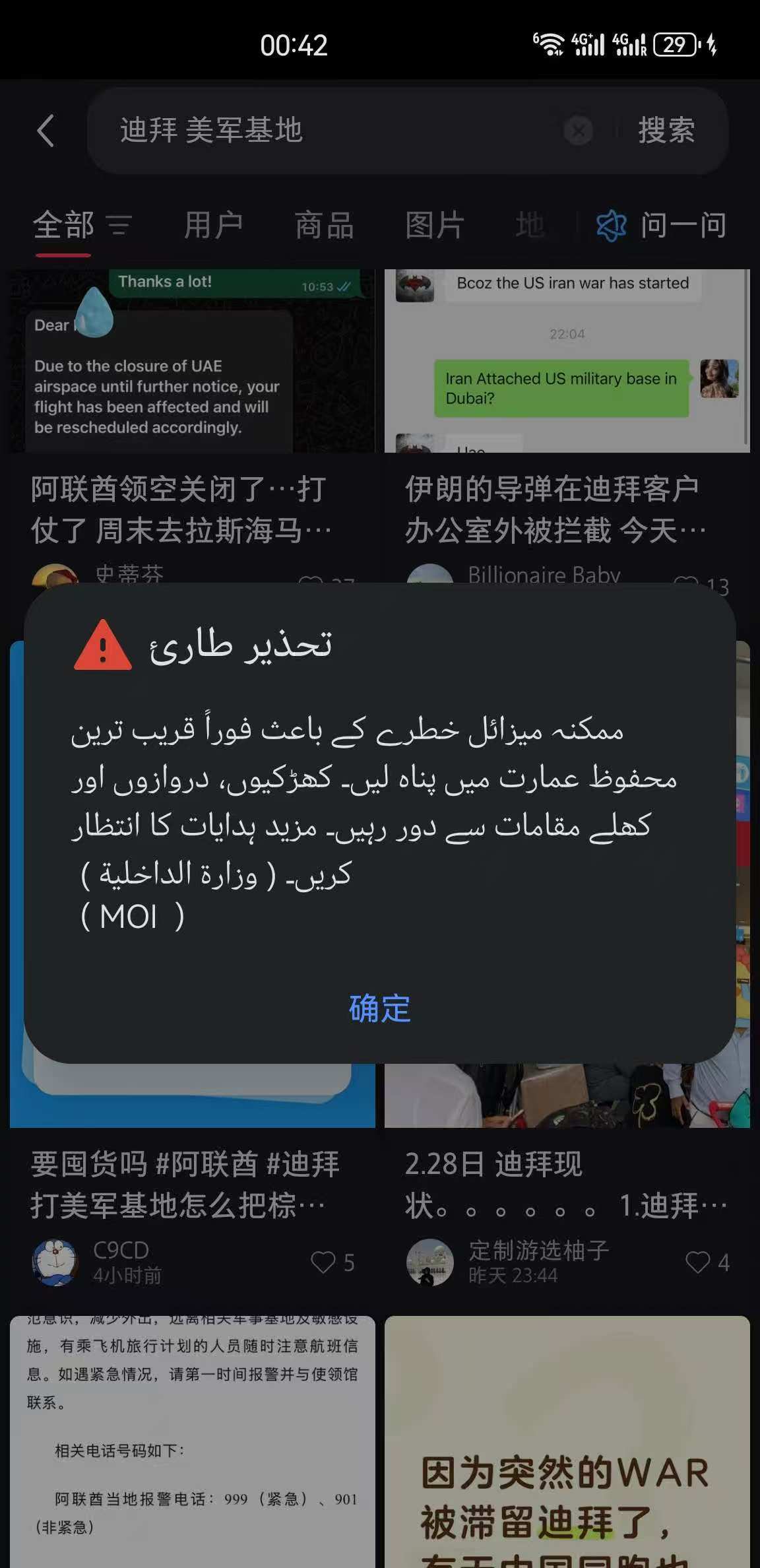 当地时间3月1日凌晨快1点,从机场回到迪拜家中,建筑师门门刷着手机缓解心情。屏幕上显示着她刚刚搜索的关键词——“迪拜 美军基地”。突然,一条紧急警报弹了出来:“鉴于当前局势,可能存在导弹威胁,请立即在安全的建筑物内避难,远离窗户、门和露天区域,并等待官方指示(内政部)。”