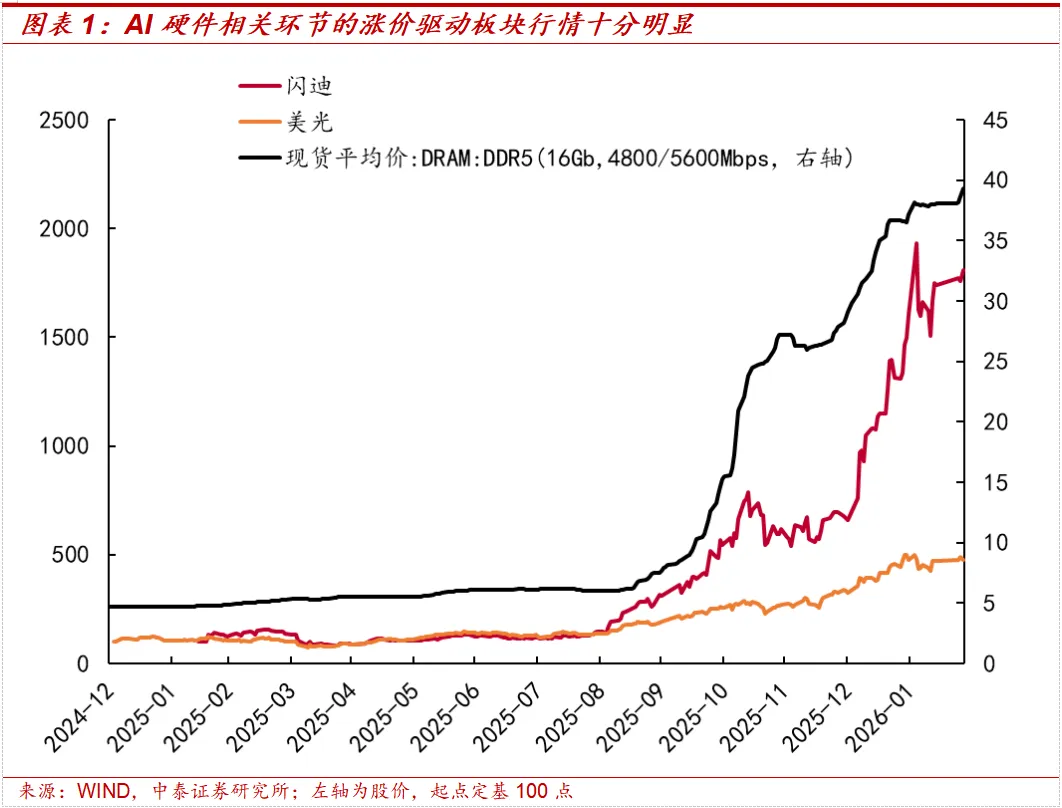 科技板块方面,内部分化明显,算力硬件与存储是本周的真正主线。存储方面,SK海力士披露DRAM与NAND库存仅剩约4周,全年涨价预期进一步强化,国产存储替代逻辑同步升温。相较之下,AI应用与大模型概念则因缺乏业绩兑现支撑而明显回撤,科技板块内部呈现出“硬件强、应用弱”的结构性分化。