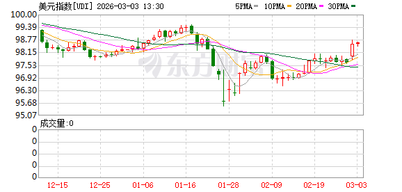 北京时间3月2日,美元指数开盘震荡上行,站上98关口。截至北京时间17时10分,美元指数盘中最高升至98.5690,日内涨幅一度扩大至近1%。