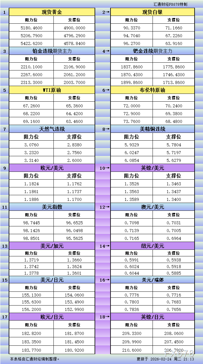 Home贵金属2月24日美市更新支撑阻力:18品种支撑阻力(金银铂钯原油天然气铜及十大货币对) 贵金属 2026 年 3 月 3 日 2月24日美市更新支撑阻力:18品种支撑阻力(金银铂钯原油天然气铜及十大货币对) By 古方信息网 - Advertisement - 文章来源:汇通网 2月24日美市美市更新的黄金、白银、铂金、钯金、原油、天然气、铜(商品)以及:美元指数、欧元、英镑、日元、瑞郎、澳元、加元、纽元(热门货币对)的支撑阻力位一览。 - Advertisement - Must Read 24小时 假期要闻汇总:9部门联合印发服务消费提质惠民行动方案 古方信息网 - 2026 年 4 月 7 日 - Advertisement - 外汇 伊朗回应美方停战提议 提出10项条款 2026 年 4 月 7 日 股票 白酒指数上周先扬后抑,三只ST股跌幅均超10%退市风险加剧丨酒市周报 2026 年 4 月 7 日 贵金属 弹药紧张、伊朗激战,特朗普怒斥援乌“0回报”,美军火库被掏空 2026 年 4 月 7 日 Related News 24小时 假期要闻汇总:9部门联合印发服务消费提质惠民行动方案 2026 年 4 月 7 日 外汇 伊朗回应美方停战提议 提出10项条款 2026 年 4 月 7 日 股票 白酒指数上周先扬后抑,三只ST股跌幅均超10%退市风险加剧丨酒市周报 2026 年 4 月 7 日 贵金属 弹药紧张、伊朗激战,特朗普怒斥援乌“0回报”,美军火库被掏空 2026 年 4 月 7 日 24小时 美股三大指数小幅上涨 存储芯片板块普涨 2026 年 4 月 7 日 - Advertisement -