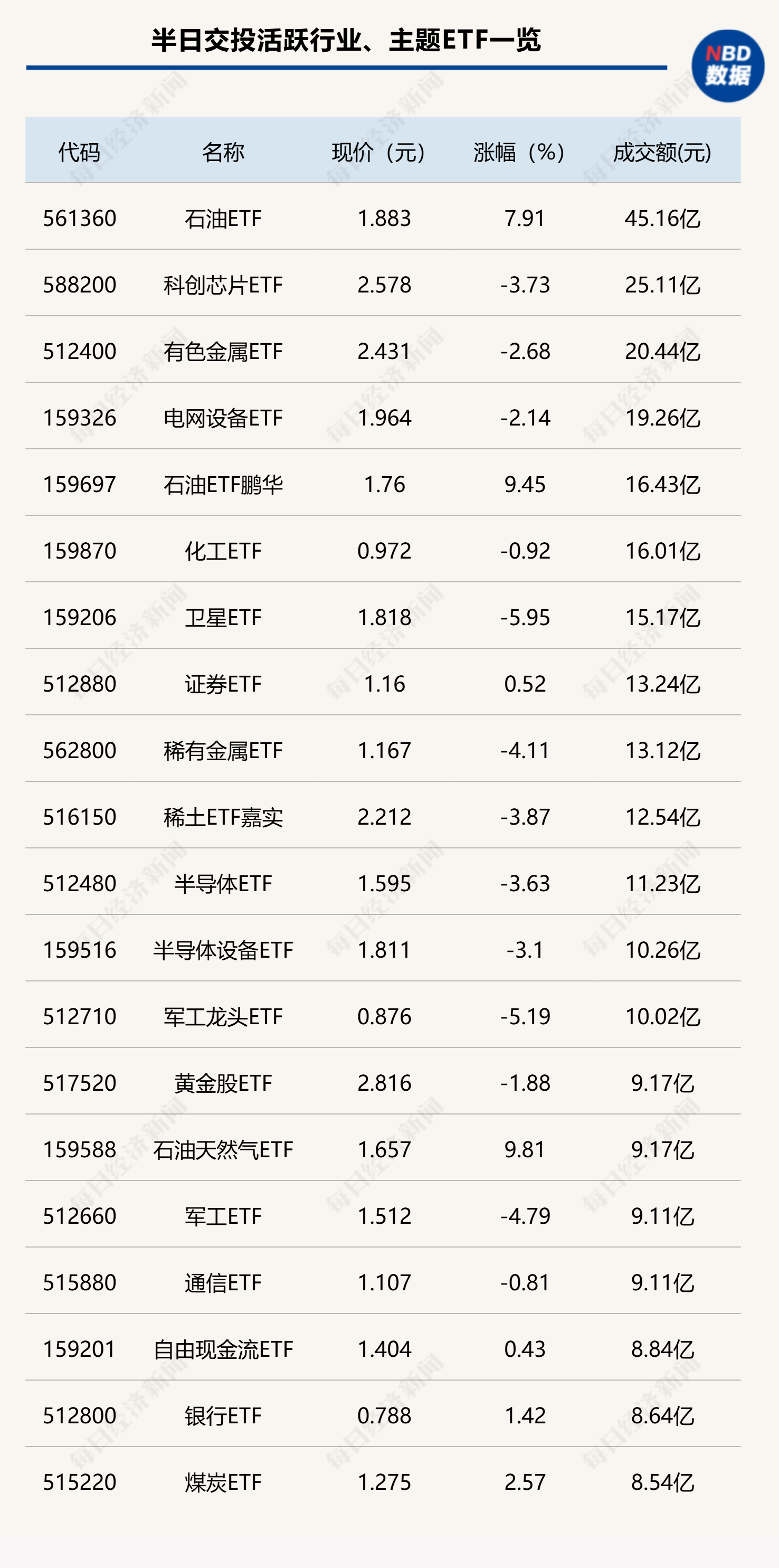 今日上午,石油ETF(561360)交投较为活跃,成交大幅放量,其半日成交金额高达45.16亿元。另外,随着股指波动较大,科创芯片ETF(588200)、有色金属ETF(512400)也出现放量成交,半日成交金额超过20亿元。跨境ETF方面, 香港证券ETF易方达(513090)半日成交金额超过50亿元。