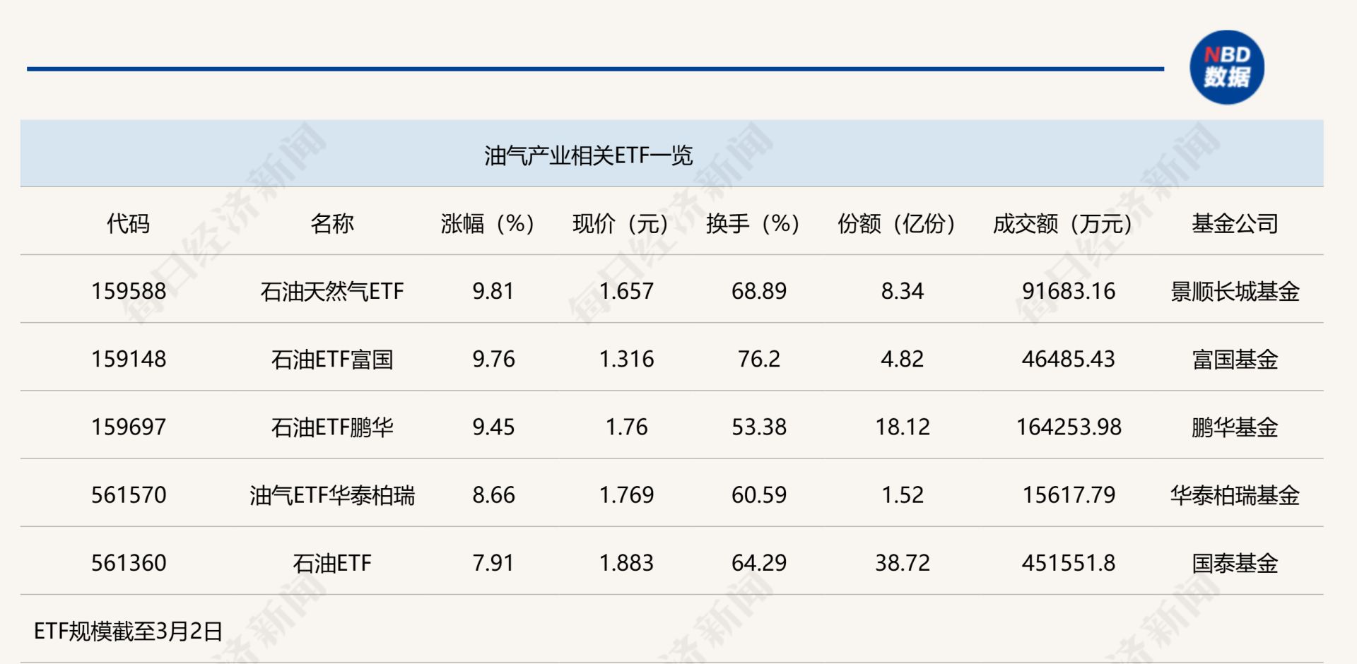 点评:石油天然气ETF(159588)、石油ETF富国(159148)以及石油ETF鹏华(159697)半日涨幅均超过9%,其中,石油ETF鹏华(159697)规模较大,ETF份额为18.12亿份,其半日成交16.43亿元,该ETF也是首只投资国内油气公司的ETF产品,其追踪的是国证石油天然气指数。该ETF产品具备分散投资并降低投资风险、综合费用更低、跟踪指数更为高效等优点,是投资者场内配置资产的重要投资工具。