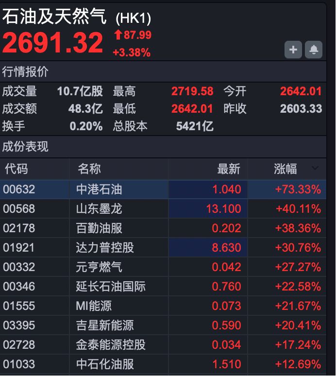 其中,昨日涨超110%的山东墨龙(HK00568),今日早间一度涨超60%。此外,中港石油涨超70%,百勤油服一度涨超100%,中石化油服涨超20%。