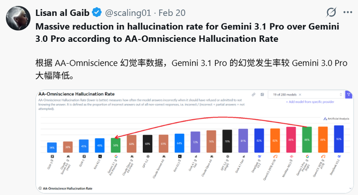 AA-Omniscience Index 跃升:该指标衡量模型的 “自知之明” 也就是对自身知识边界的认知(抗幻觉)。Gemini 3.1 Pro 从上一代 13 分跃升至 30 分,位居主流模型第一——这意味着它拒绝回答不熟悉问题的准确率更高,在擅长领域给出错误信息的概率更低,减少胡说八道的概率。