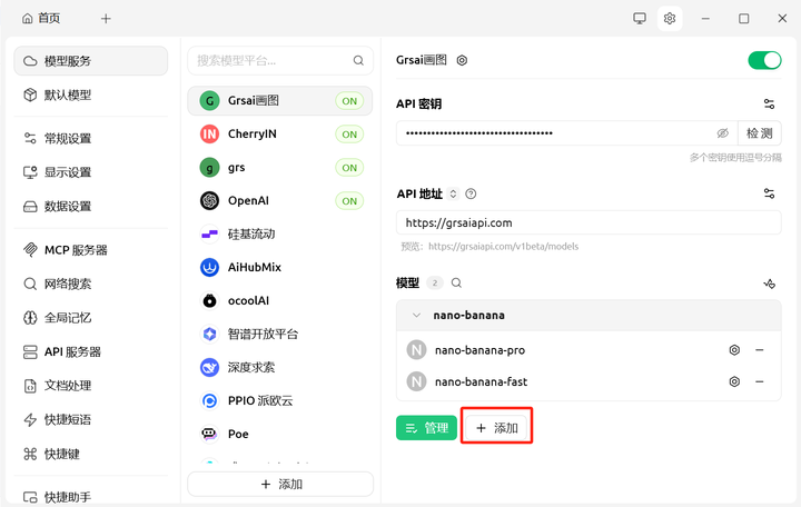 Cherry Studio 黏贴 ApiKey(保密不可外泄)和 APi 地址(base url):https://grsaiapi.com