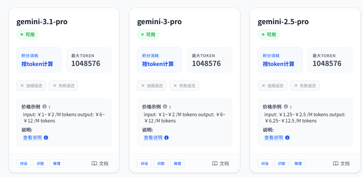 - Gemini-3.1-Pro:input¥1~¥2 /M tokens,output ¥6~¥12 /M tokens